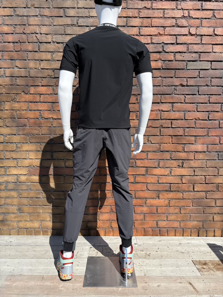 布帛やコンプレッションシャツに近いしっかりとしたハリとコシのある生地で手持ち感が抜群です。またニット生地にポリウレタンを混紡しているので縦横斜め全方向に対して高いストレッチ性も併せ持っています。