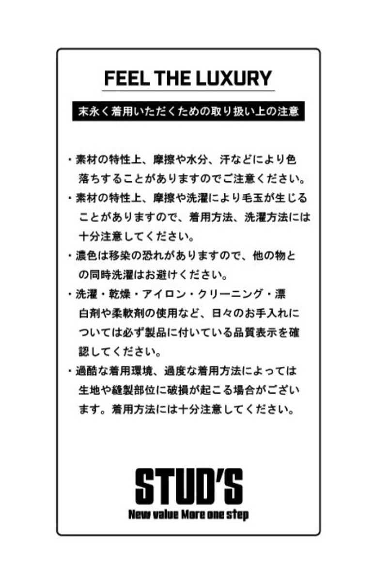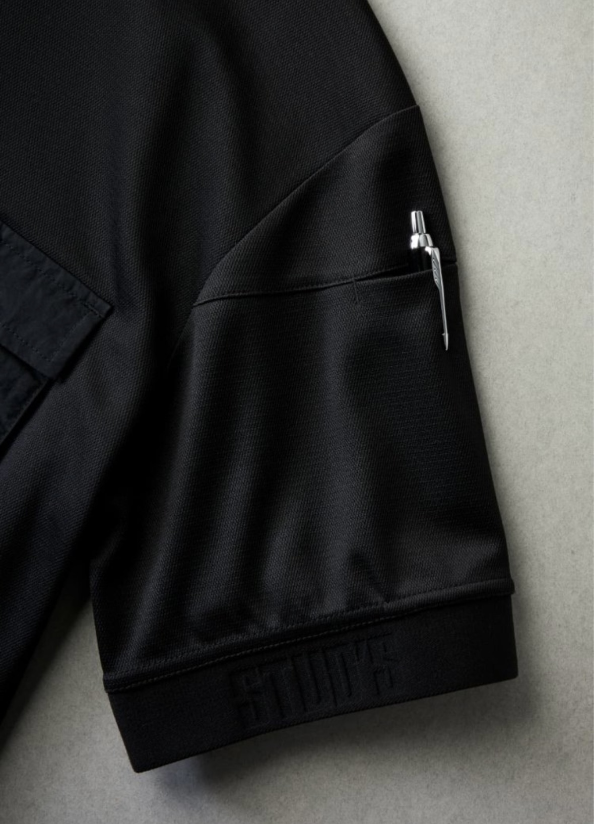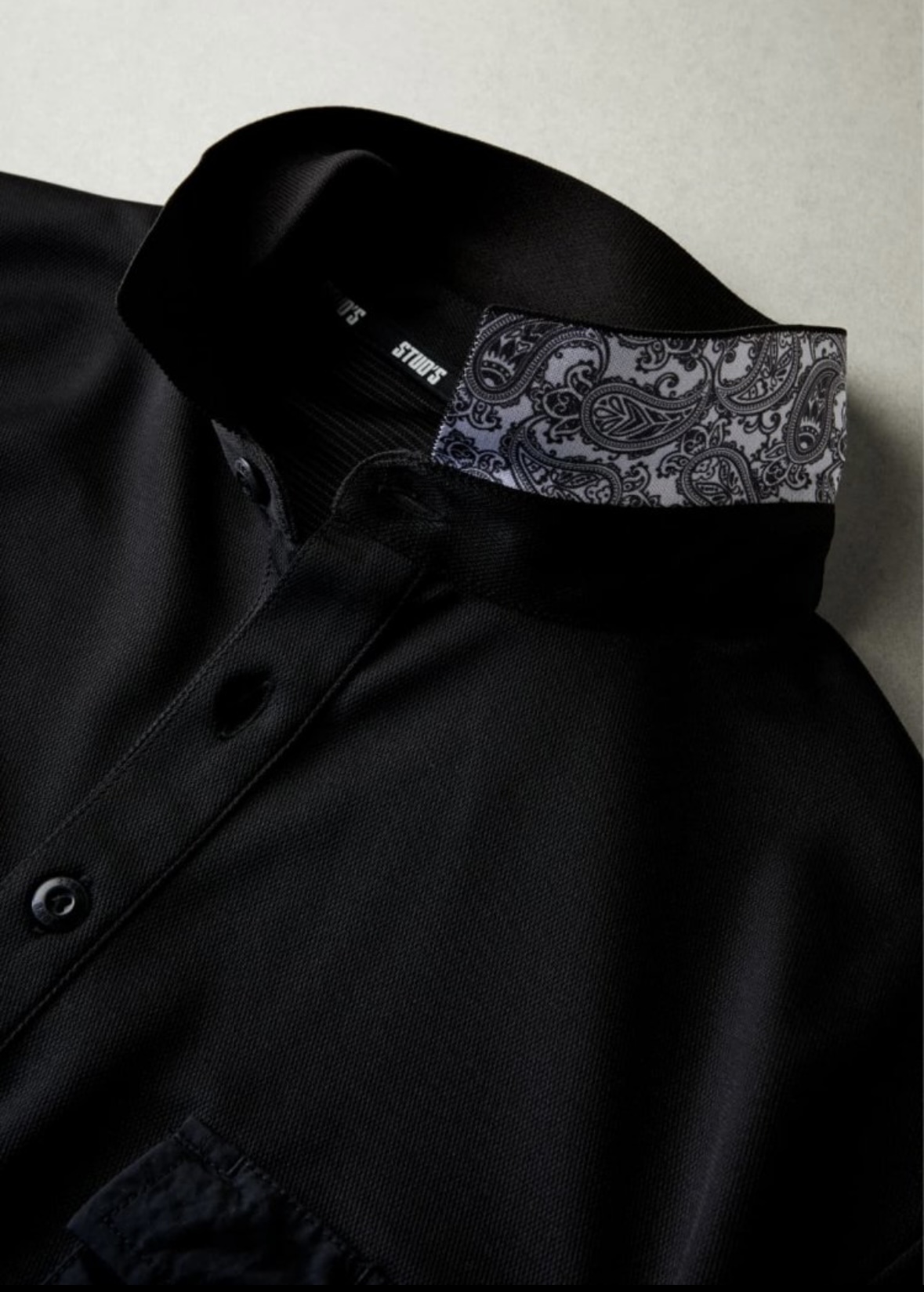 襟裏ペイズリープリント、STUD’Sロゴをエンボス加工した袖リブ、オリジナルワッペンなどでおしゃれ着として着用できるデザイン製もありながら高い消臭効果、胸に耐久性のある異素材ポケット、胸ペン差し、袖ペン差しなどワーク機能もしっかり搭載しています。