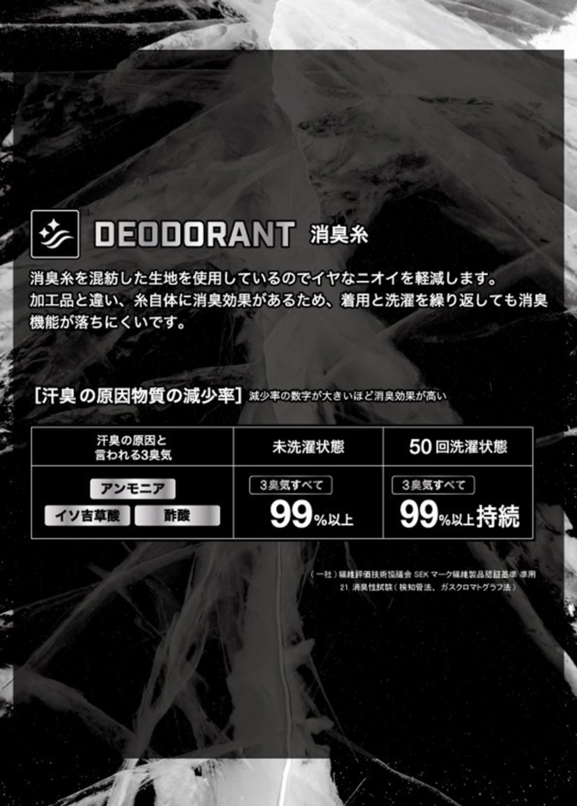 ※50回洗濯後の消臭試験でもアンモニア、酢酸、イソ吉草酸に対して99%の消臭効果を確認済。