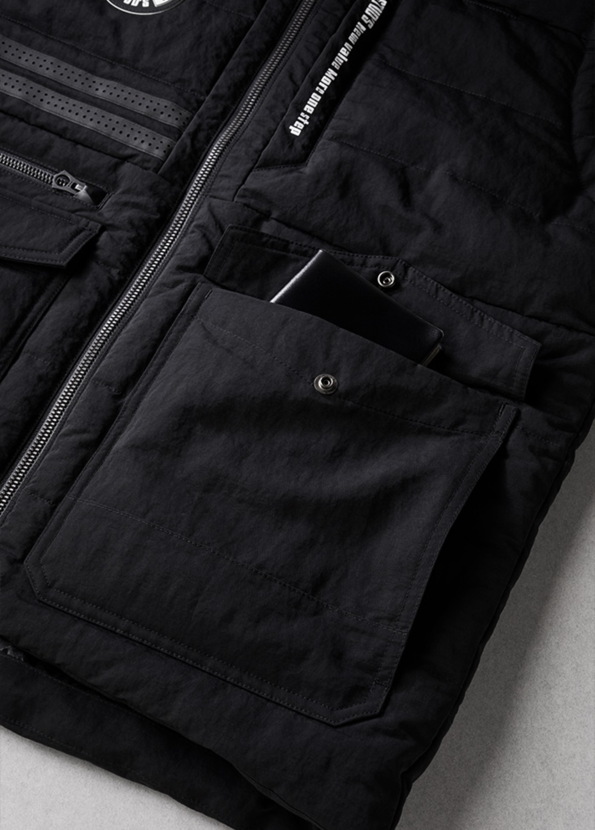 左胸に隠しファスナーポケット、腹部に左右ファスナーポケットと左右フラップ付きポケット、さらに左右フラップ付きポケットの横からは手が入るハンドウォームポケット、身頃の内側には内ポケット、左胸にペン差しポケットと合計9か所にポケットを搭載し、高い収納力を兼ね備えています。