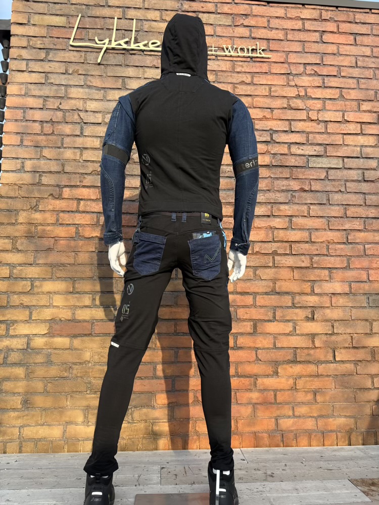 前身頃にはデニム生地、後身頃には伸縮性に優れたスウェット生地を使用。