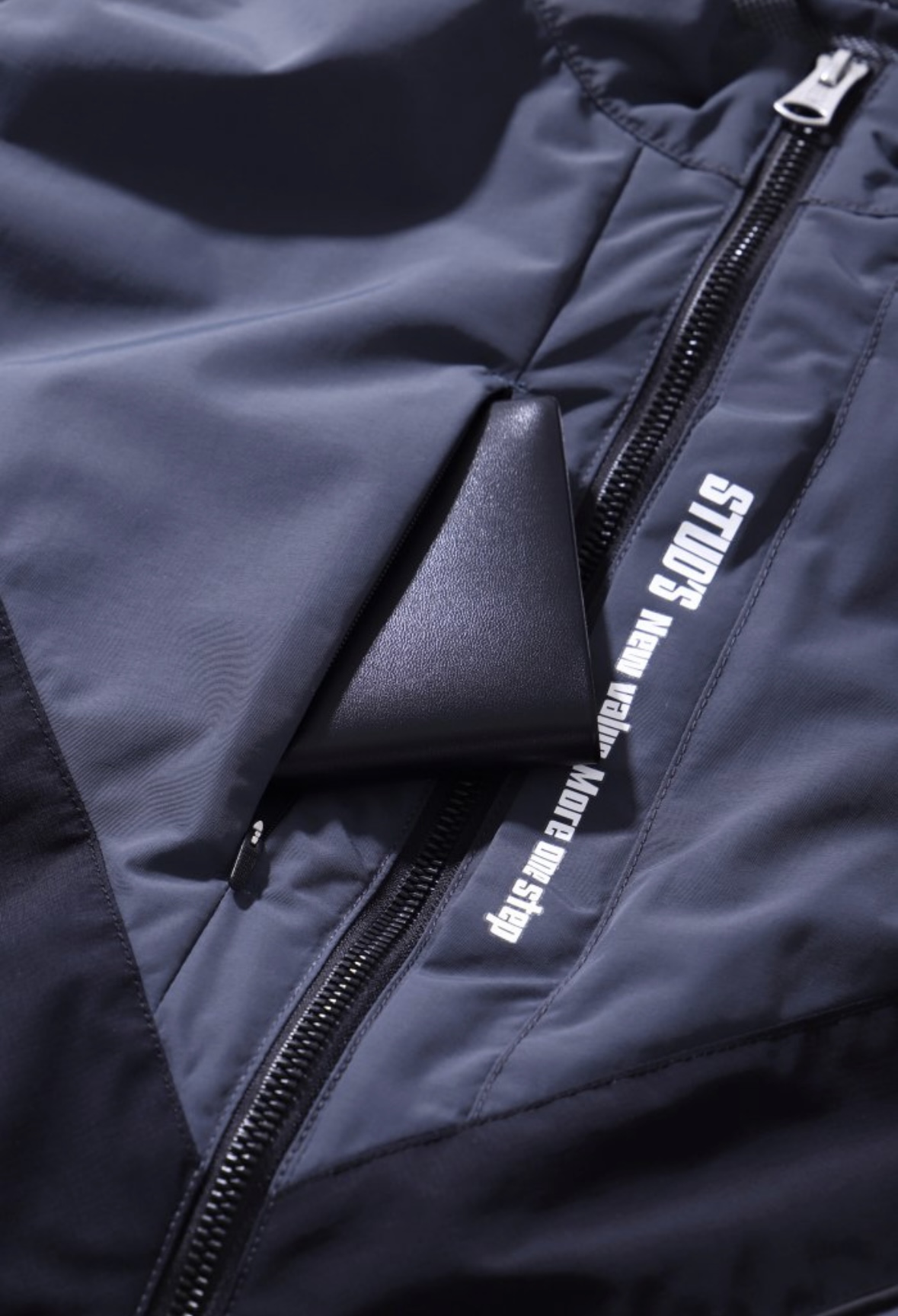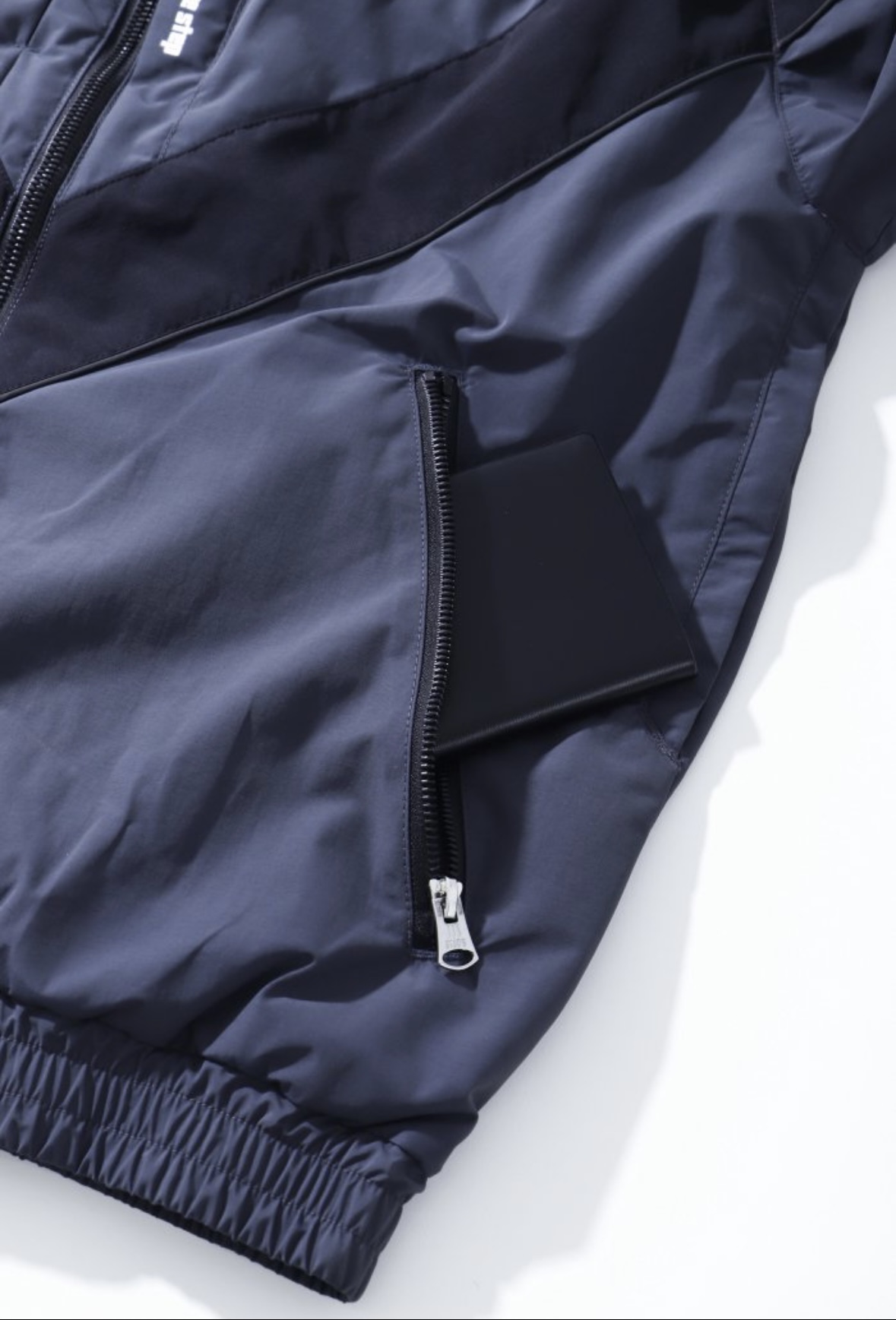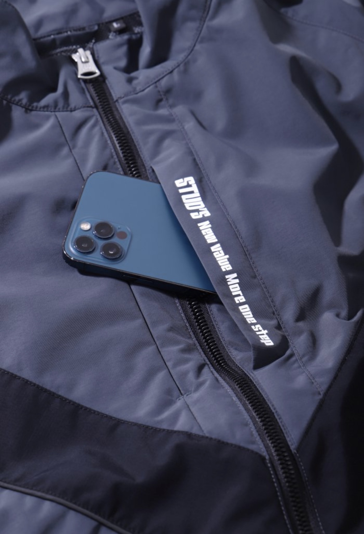 ポケット一覧:右胸シームファスナーポケット、左胸隠しファスナーポケット、両脇ファスナーポケット、内側見返し左右ペン差し