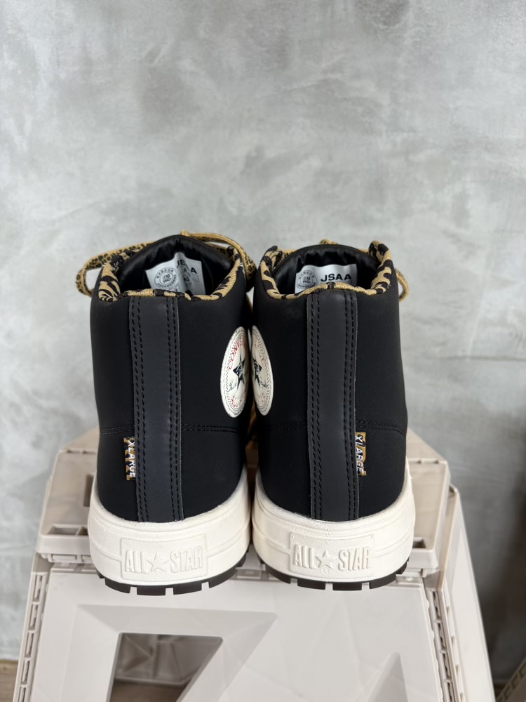 「XLARGE(エクストララージ)」の25SSコレクションで使用予定のオリジナルレパード柄をライニングとシューレースに採用し、アンクルパッチのスター部分にOGゴリラをレイアウトしたコラボならではのデザイン。