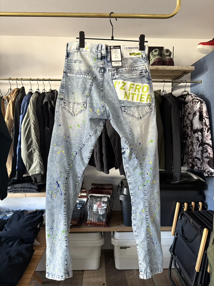 ペンキ加工、右後ろポケットにライムグリーンのアイズロゴ。右足に大きなアイズロゴを配置。
