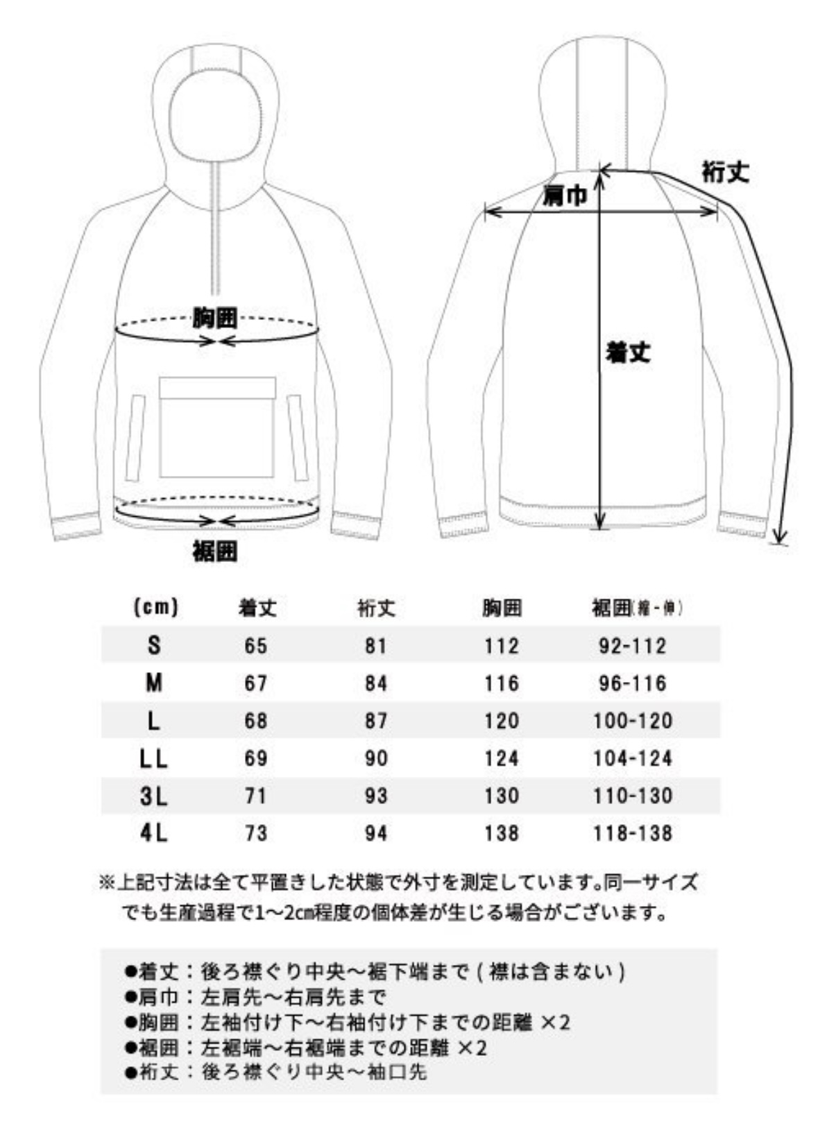 該当箇所:フード、両袖上部、腹部ビッグポケット、袖口、裾