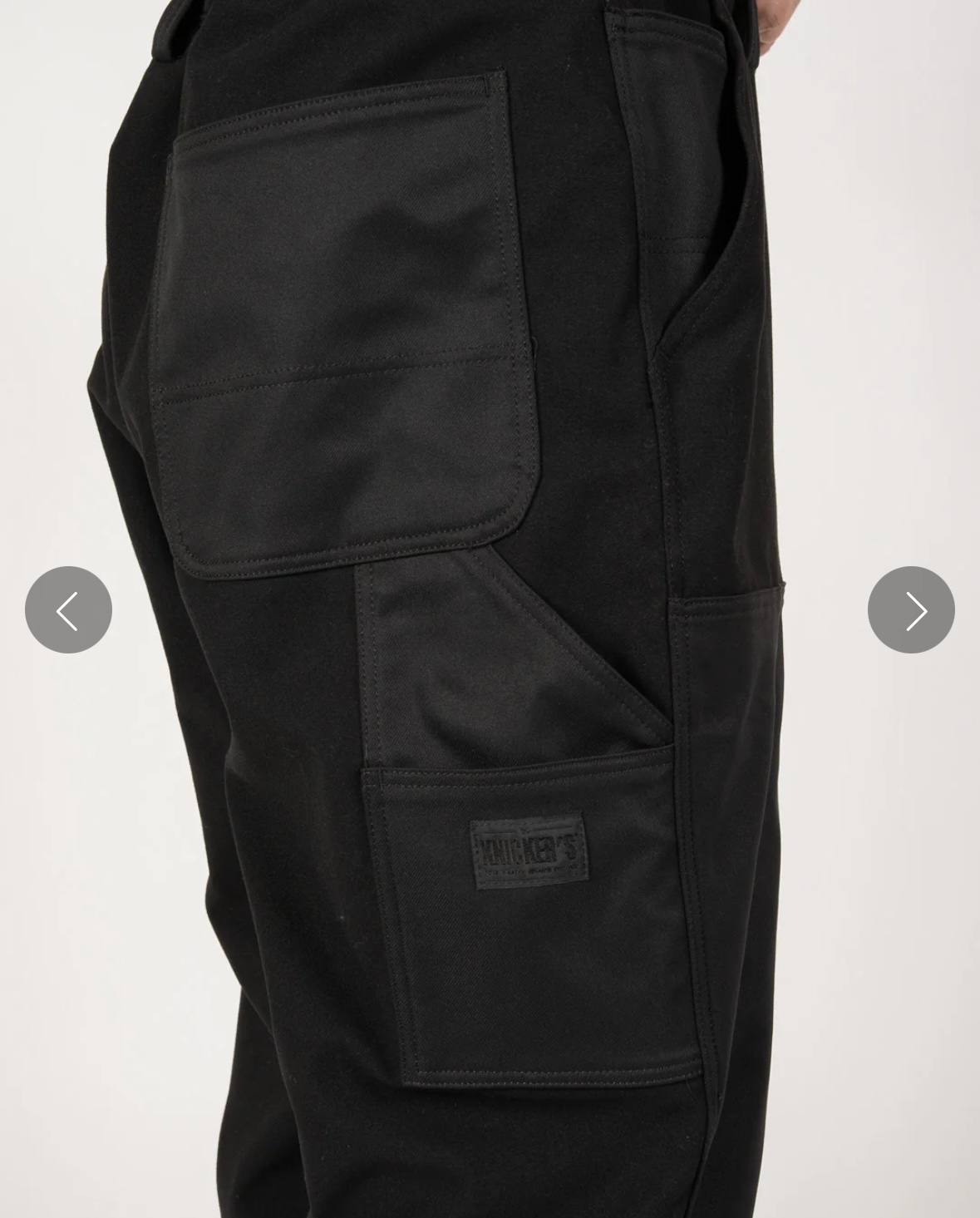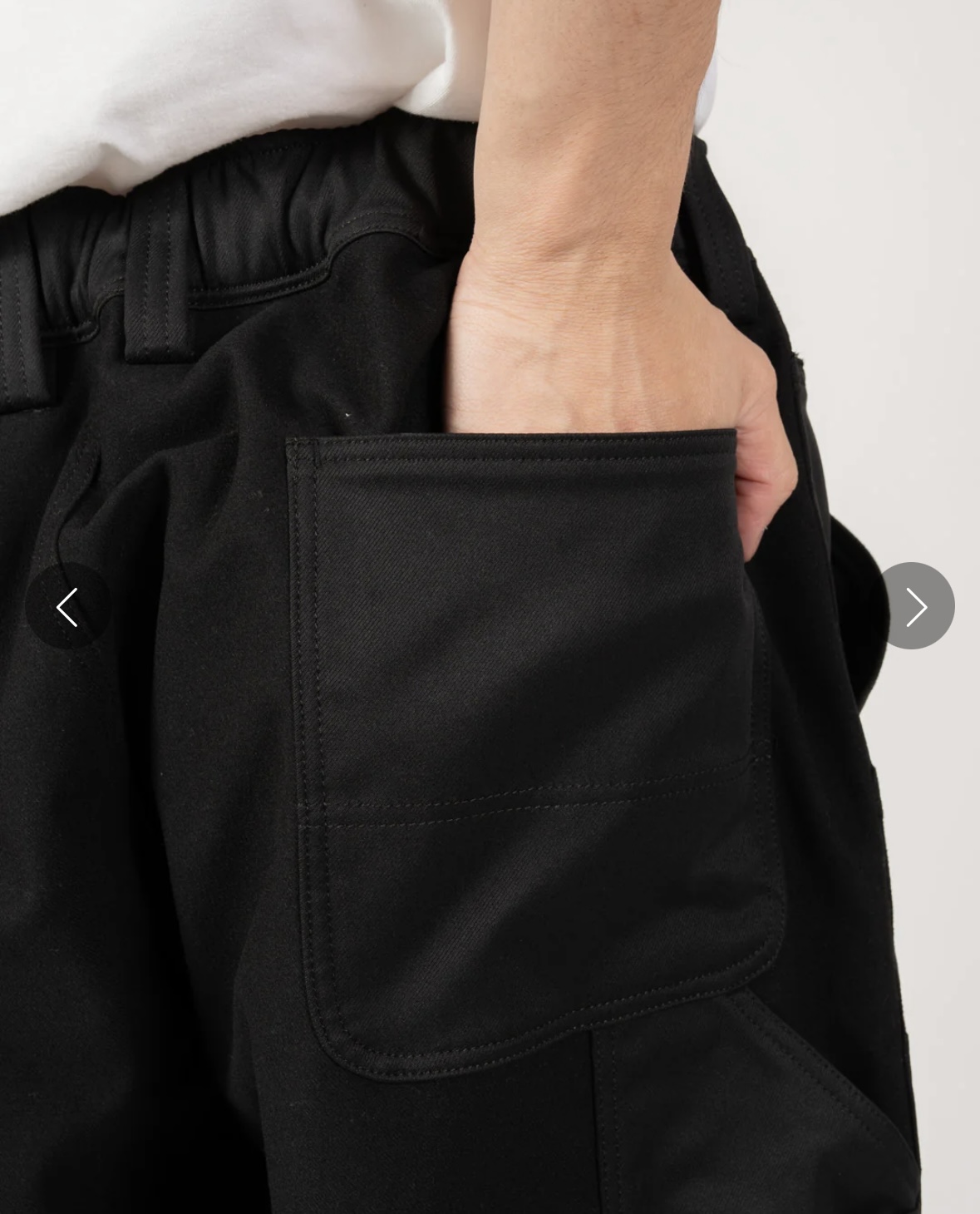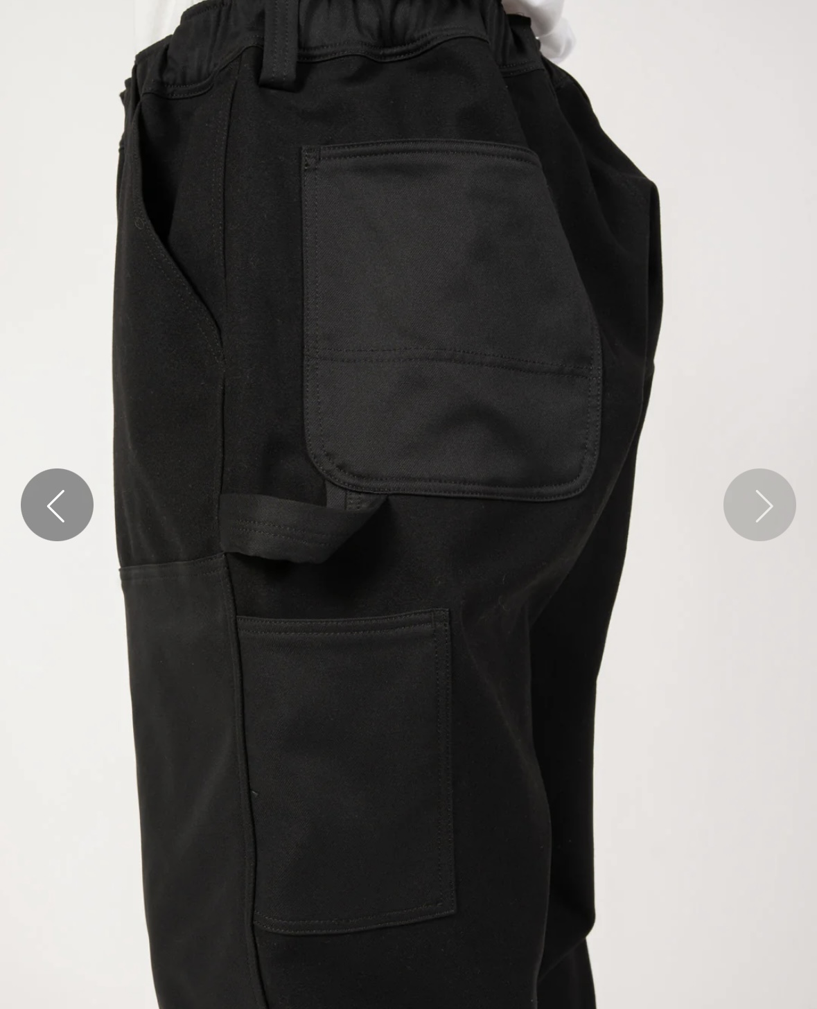 カーペンターパンツの仕様を取り入れ、サイドに小物ポケットやハンマーループを付けている。
